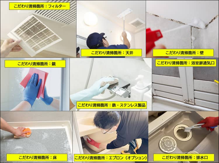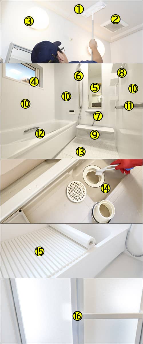 インターネット工務店の浴室清掃は、浴室内全て(オプションを含む)が清掃対象です。 浴室内は、水アカ・石化カルキ・石けんカス・皮脂汚れ・カビ等、様々な汚れがたまりやすい場所です。汚れや雑菌の種類により、使用溶剤や清掃方法が異なるため、家事清掃の中で最も難しい清掃場所と言われています。 そのような、普段のお掃除では手に負えないところも、インターネット工務店のプロスタッフが汚れの箇所や状態を見極め、それに合わせた溶剤を使用し、しっかりクリーニング洗浄いたします! 清掃後のピカピカになった浴室をご堪能ください! |