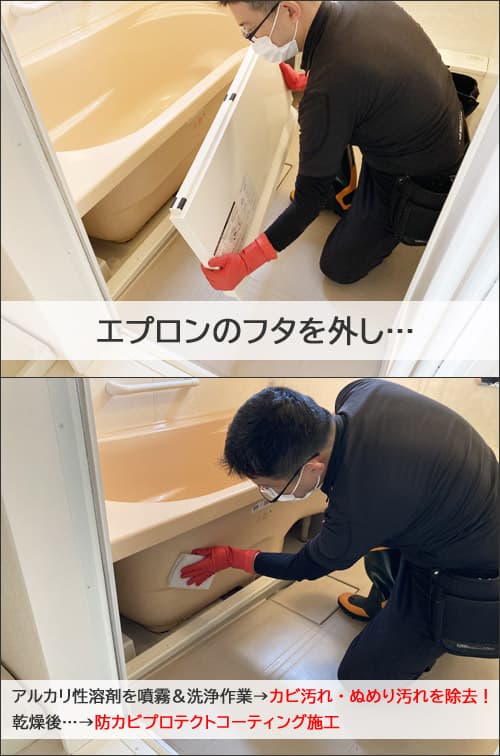■サービス名:エプロン内部クリーニング(カビ汚れ除去・洗浄作業・防カビプロテクトコーティング施工) ■ターゲット:エプロン内 ■施工方法と効果:エプロン内部にアルカリ性溶剤を噴霧し、既存のぬめり汚れやカビ汚れを洗浄除去。その後、防カビプロテクトコーティング施工(エプロン内部にアルカリ性防カビ専用溶剤を噴霧) 検出頻度の高い60菌種を含む71菌に対して抑止効果を確認(横浜油脂工業防カビ試験結果) 施工箇所のカビ発生を抑え、清潔に保つことができます。 ■料金:5,500円(税込) |